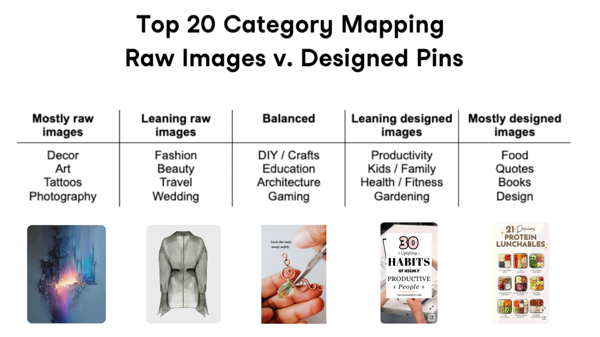 Tailwind mapped both raw and designed Pins across 20 categories of various interests, such as art and fashion, to identify which Pin aesthetic the most viral Pins represented in each category. The findings revealed that specific categories favored more raw images, while others preferred more designed Pins. Overall, the mix differed dramatically across all categories.